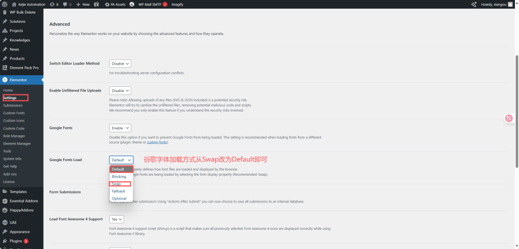 Elementor编辑器字体和前端显示字体不一致 Elementor编辑器字体和前端显示字体不一致 2025年12月26日 大白 问题:Elementor编辑器内设置的字体和前端显示出来的字段不一致 解决方案: 把Elementor -> Settings -> Advanced -> Google Fonts Load 改为Default